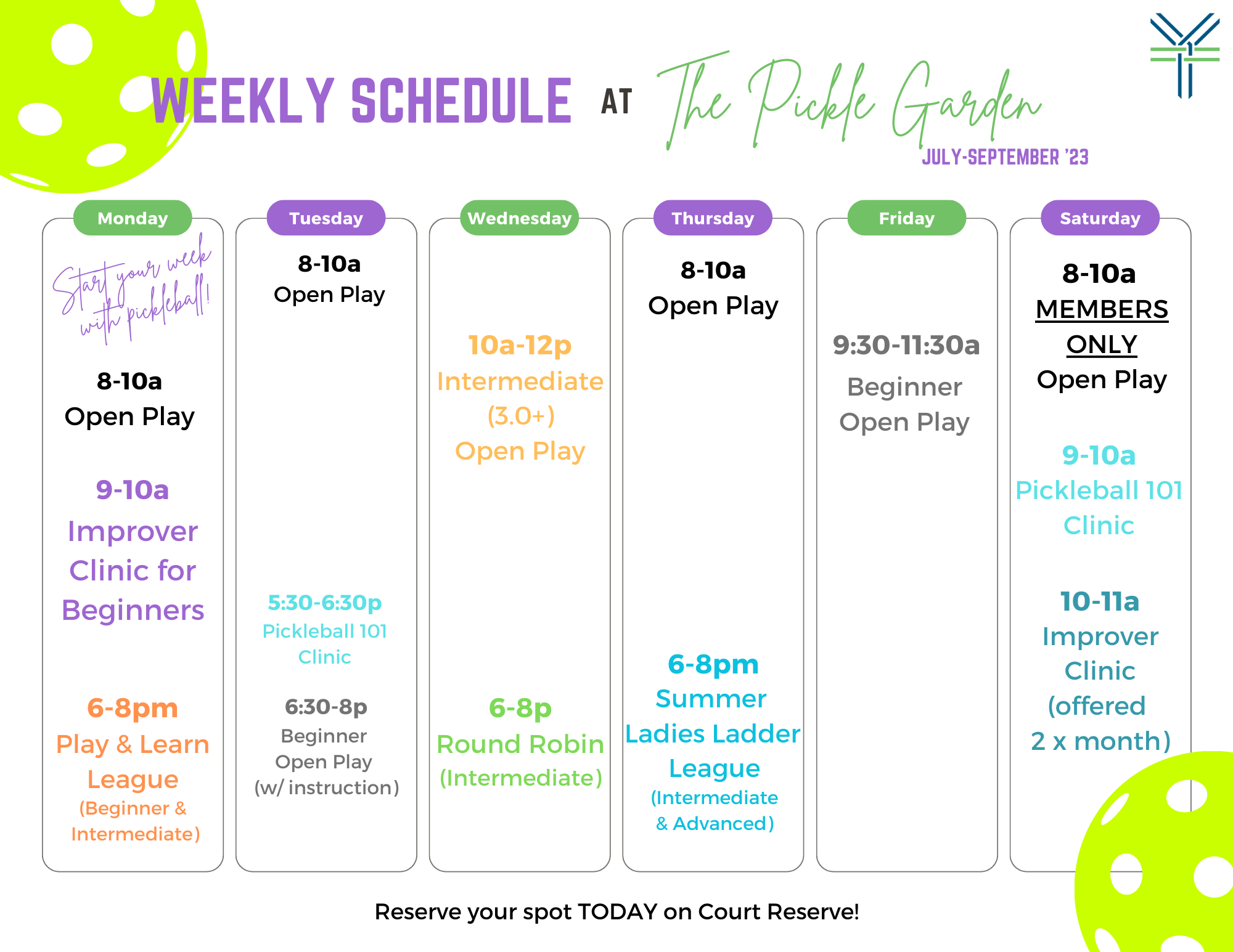 For the most up-to-date schedule and registration information, please click here to view our dynamic calendar on CourtReserve.
